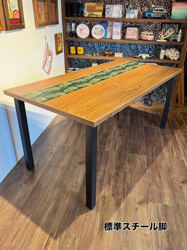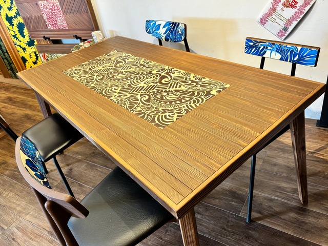 ストレートウッドとヘリンボーンのコンビにブ ラウンのタパ柄で製作を ブラウンでまとめたダイニングテーブルの仕上がりは大人ハワイアン♪ リビングやお店のアクセントに活躍する事間違 い無しです サイズは約160x80x70で大人4人~6人がゆったり使えるサイズ 仕上げはこだわりのエイジング加工、樹脂加エ、ウレタン塗装、ツルツルすべすべのB-sun 仕様♪ *写真はオプション木製脚+¥25,000取付け、 標準仕様はスチール脚5センチ角が付属します *椅子は付属しません *沖縄、離島の配送料は別途見積もりなりますのでご注意下さい